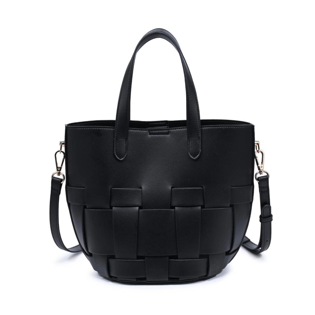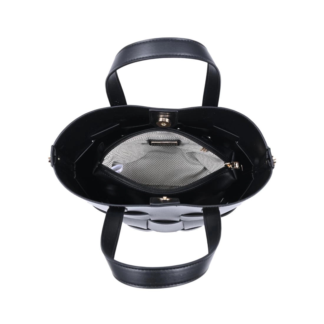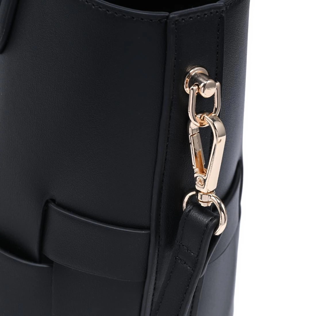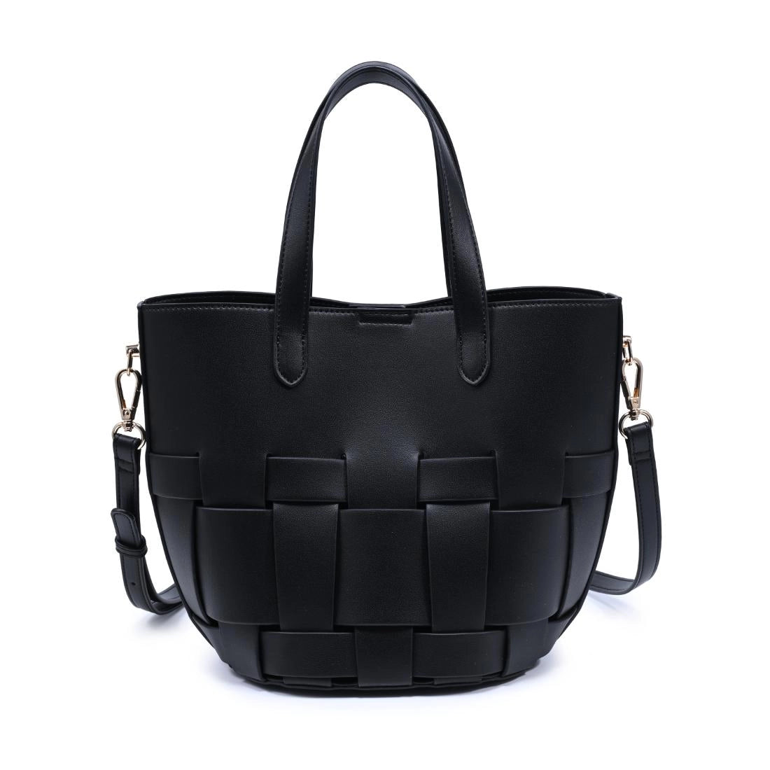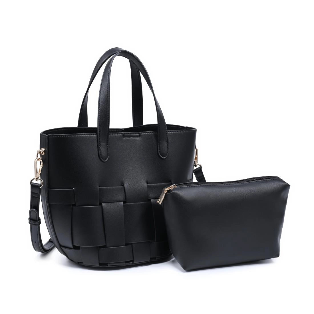 A woven-panel tote with detachable strap and included zip pouch. Sculpted silhouette, woven front detail, dual top handles and adjustable crossbody strap. Included zip pouch for cosmetics or tech, gold-tone hardware. Roomy interior fits daily essentials, office files and weekend finds. Contemporary, versatile and polished — the perfect work-to-weekend companion for trend-aware, practical wardrobes.