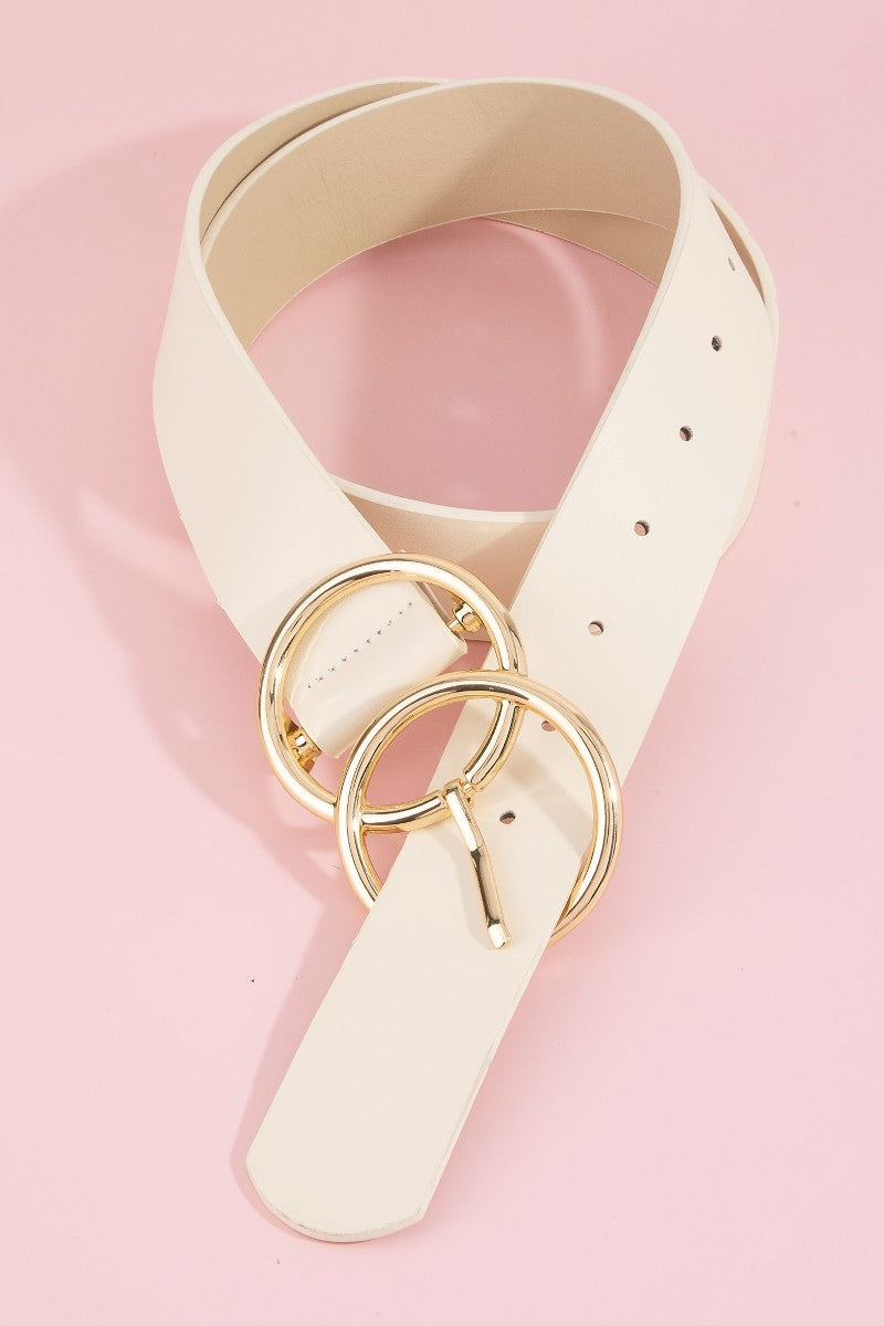 - Faux leather belt with gold-tone metal double ring buckle