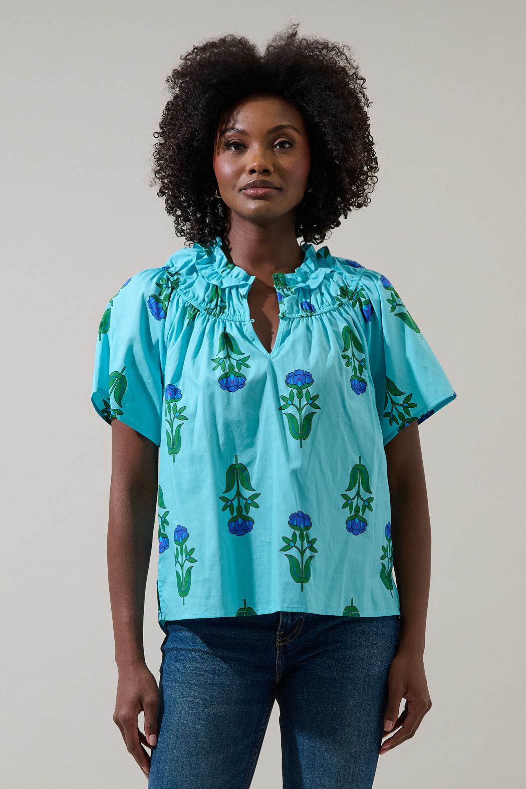 Show up and show off in this darling top. This short sleeve top has a split neck, relaxed fit, with a ruffle detail to give you a chic look. Throw on some trousers and heels for dressed up look or keep it casual with sneakers and jeans.