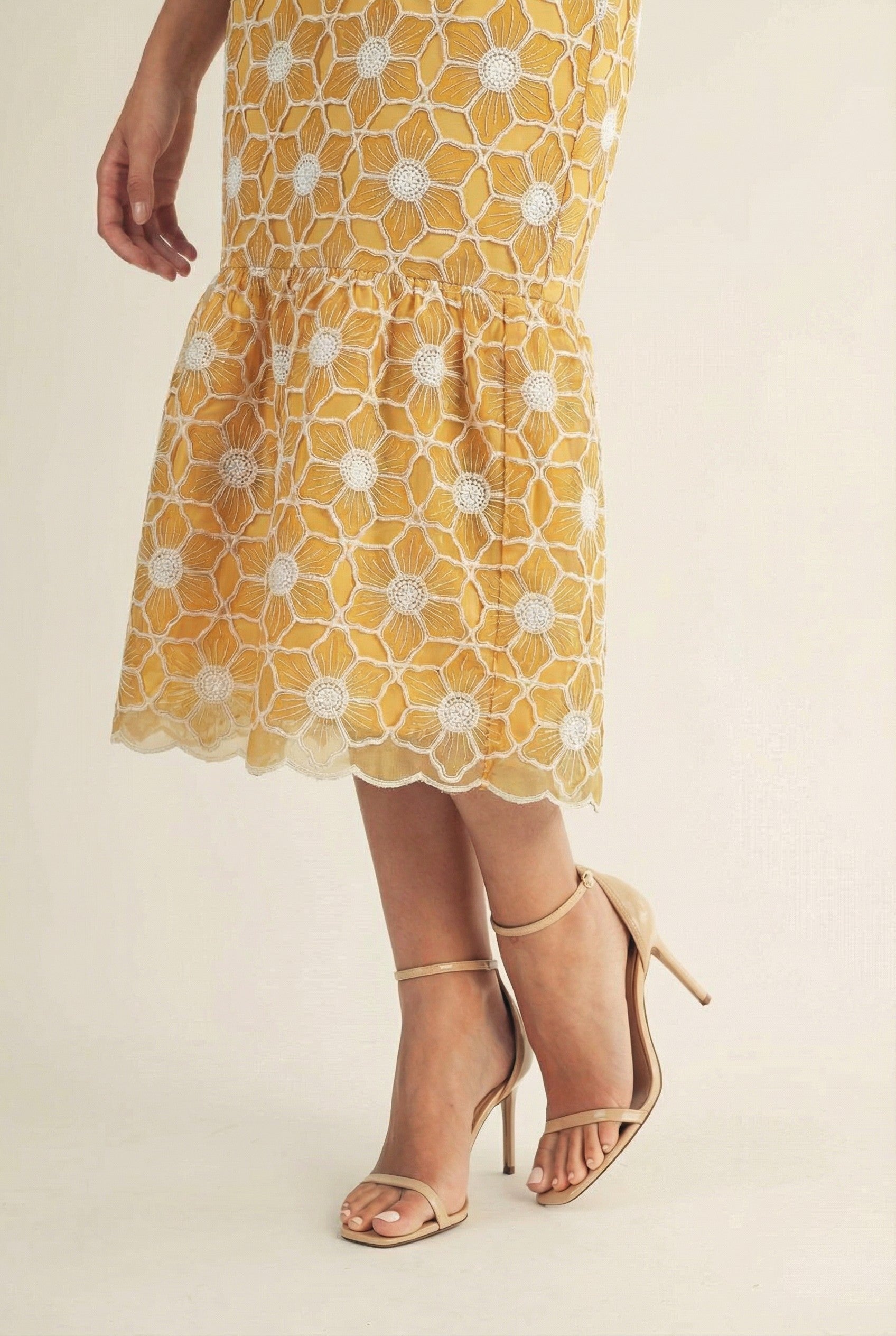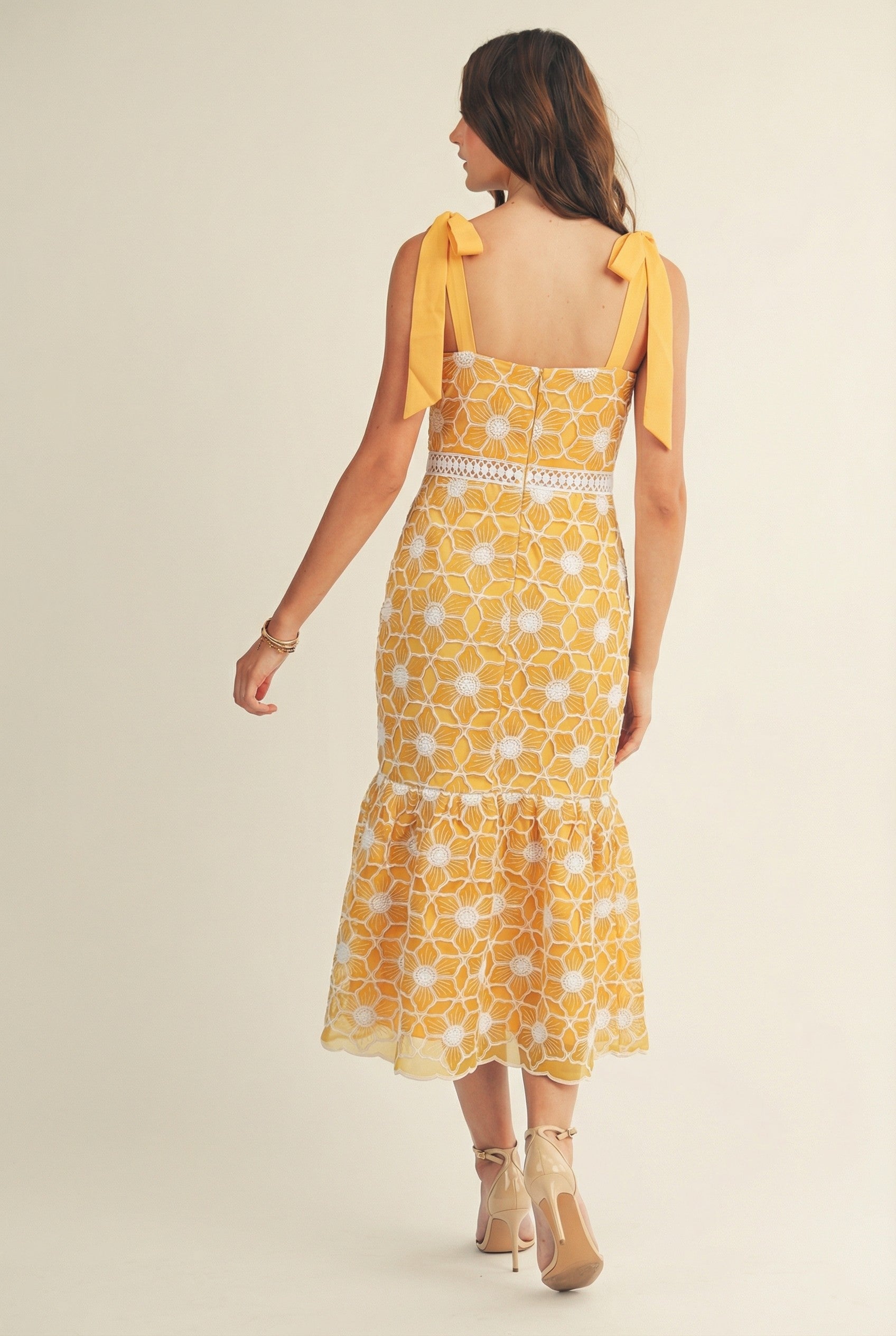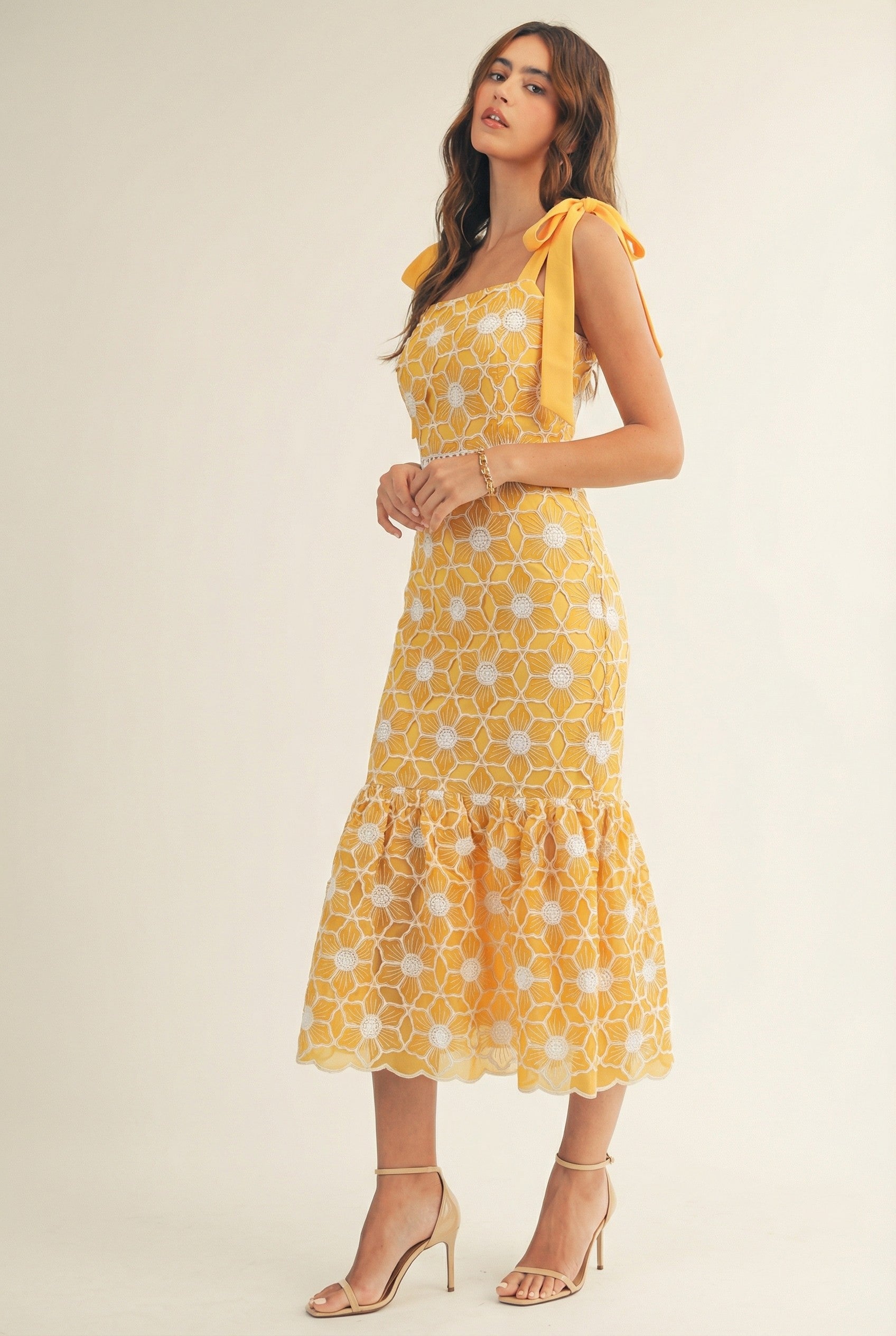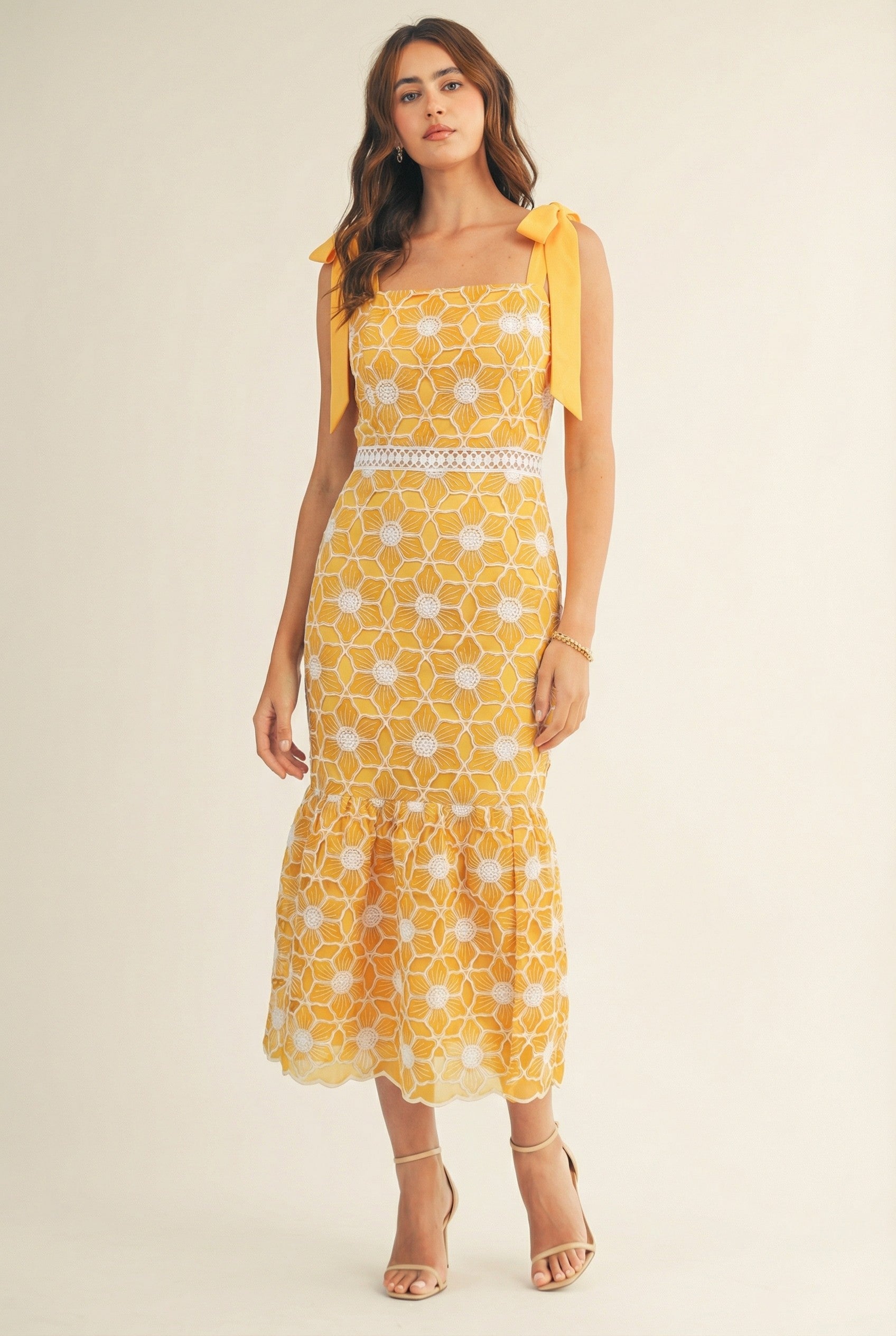 A romantic floral lace midi dress designed with statement bow-tie shoulder straps and a flattering fitted silhouette. Featuring delicate embroidered florals, a lace-trimmed waist, and a softly flared hem, this dress transitions effortlessly from daytime events to evening occasions with elegance and charm.