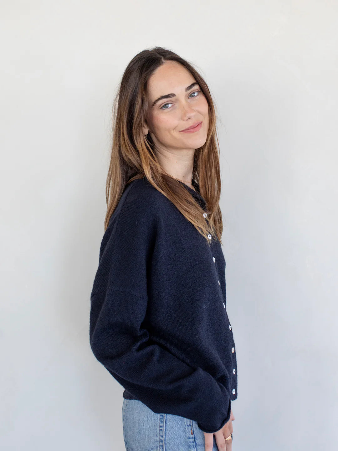 Soft and lightweight cardigan with buttons. 52% Recycled Polyester, 30% Polyester, 15% Acrylic, 3% Spandex.