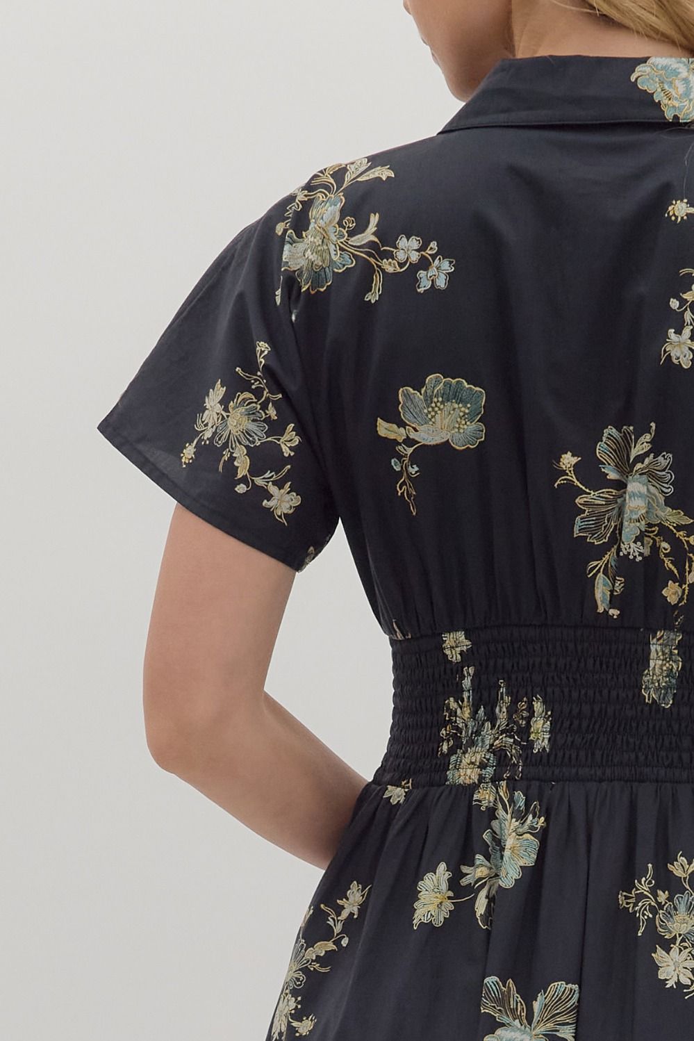 Floral print short sleeve midi dress featuring smocked waist. Zip-up closure at front. Side pockets. Lined. Woven. Non-sheer. Lightweight. 80% Polyester, 20% Cotton.