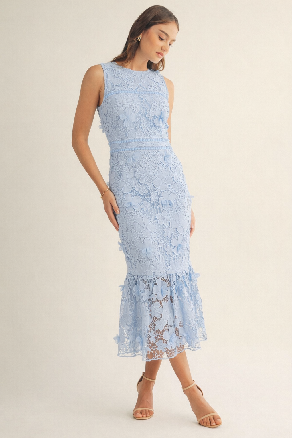 An elegant sleeveless midi dress featuring intricate floral lace throughout. Designed with a fitted silhouette and sheer lace hem for a sophisticated finish. Perfect for cocktail parties, weddings, and special occasions.