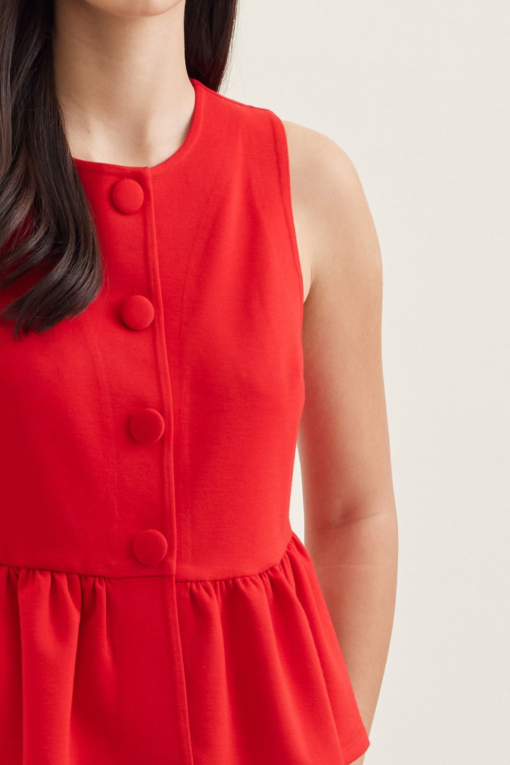 Solid sleeveless peplum top featuring covered button detail at front. Unlined. Knit. Non-sheer. Lightweight. 58% Polyester, 27% Rayon, 8% Nylon, 7% Spandex.