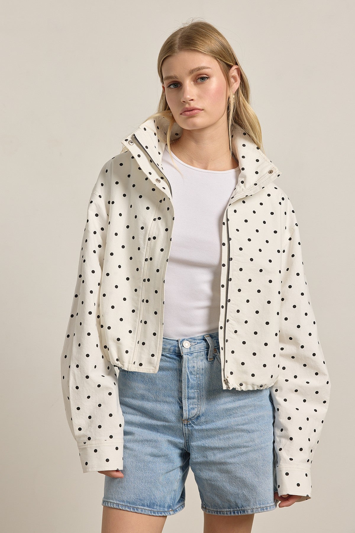 A playful yet modern jacket featuring an all-over polka dot print. Designed with a structured high neck and adjustable drawstring hem for a relaxed, easy fit. Crafted from soft woven cotton fabric - lightweight yet crisp - perfect for transitional weather styling.