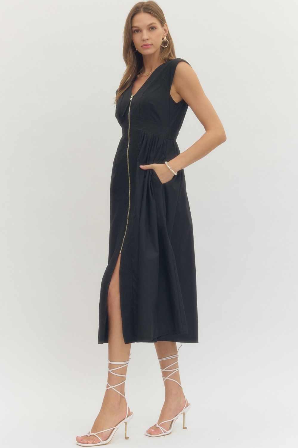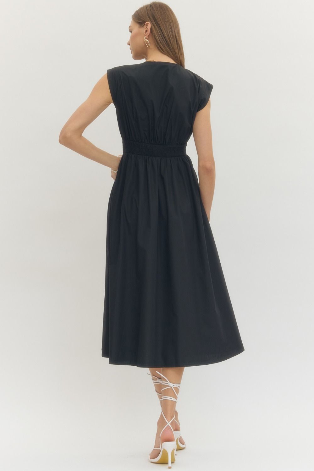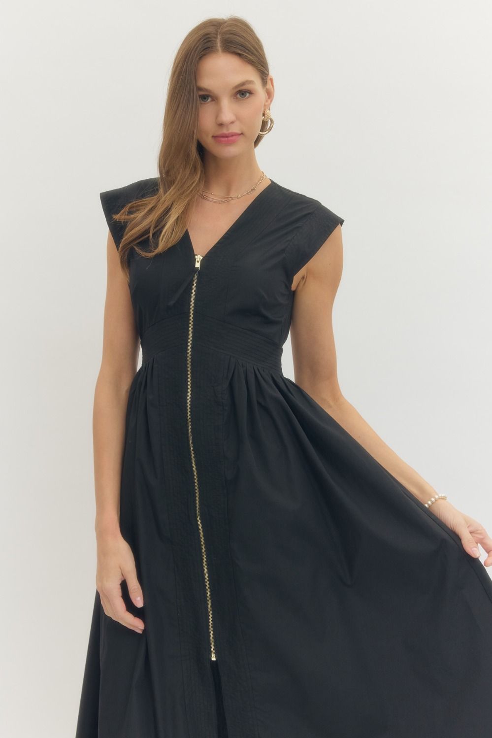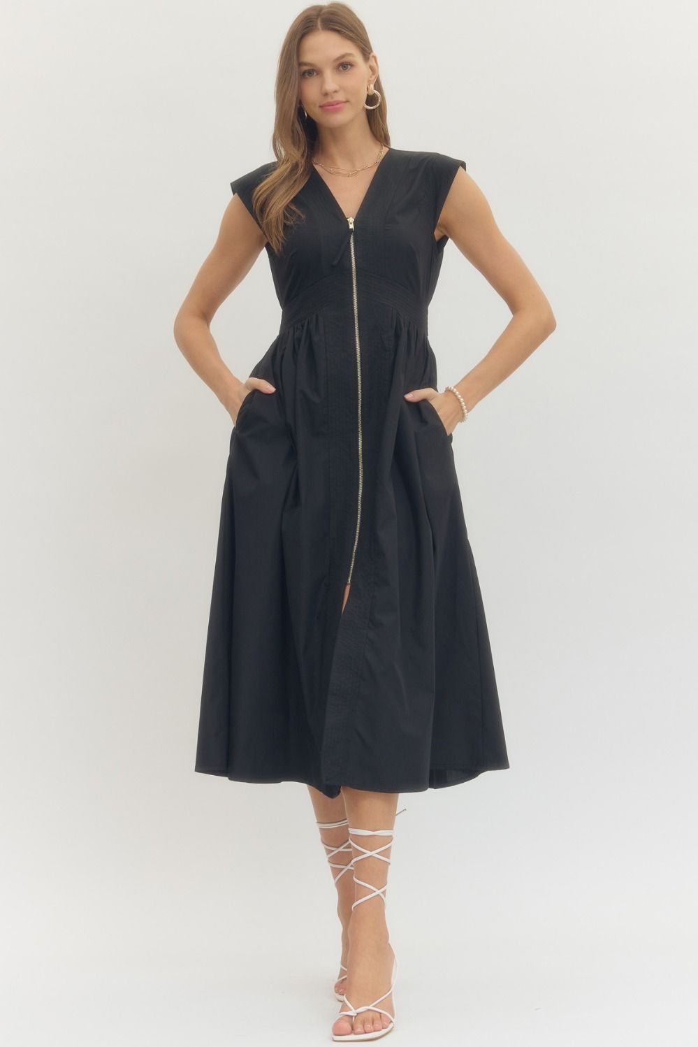 Solid V-neck zip-front cap sleeve midi dress featuring textured stitching bands. Smocked waistband at back. Side pockets. Lined. Woven. Non-sheer. Lightweight. 80% Polyester, 20% Cotton.