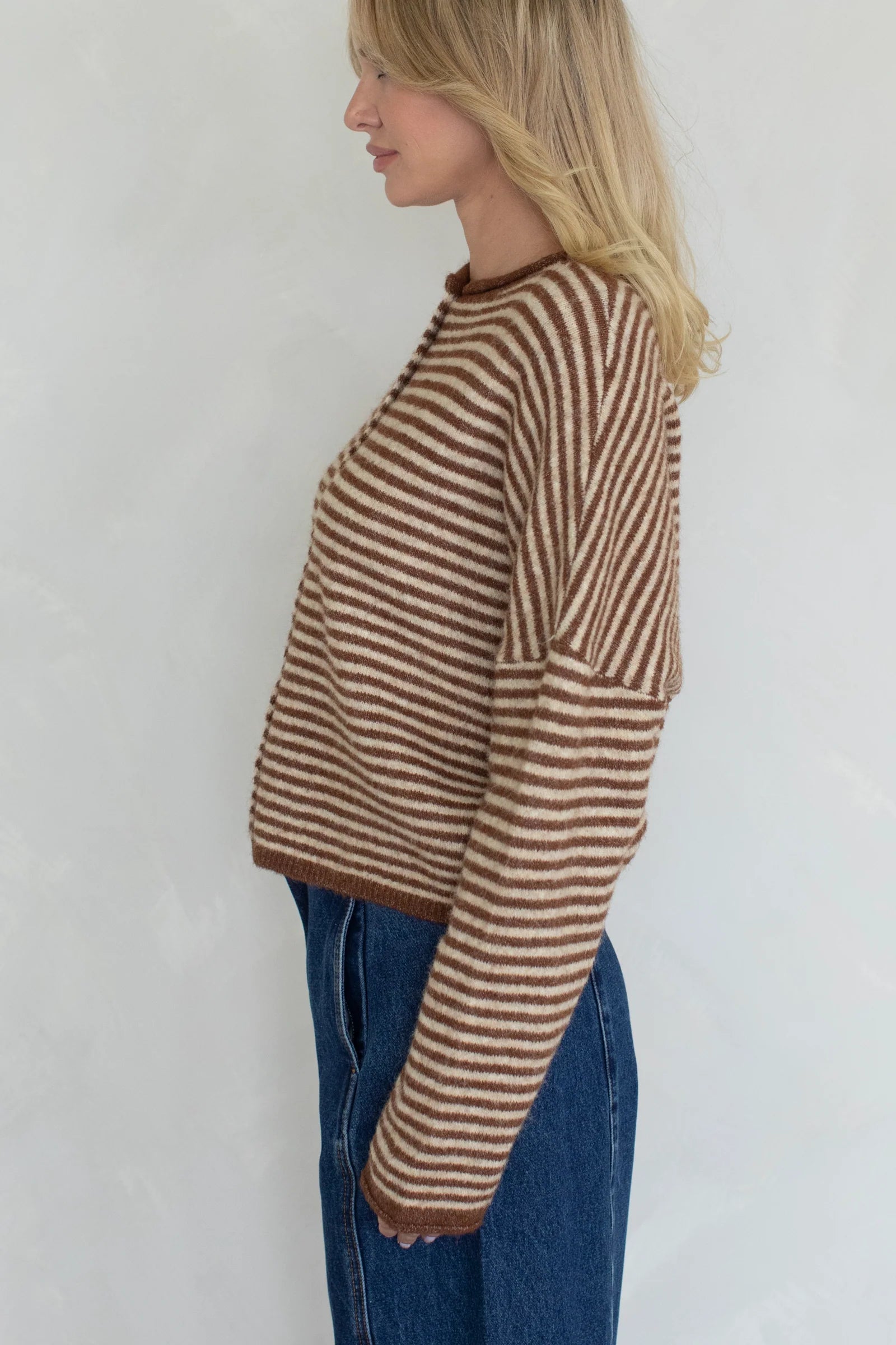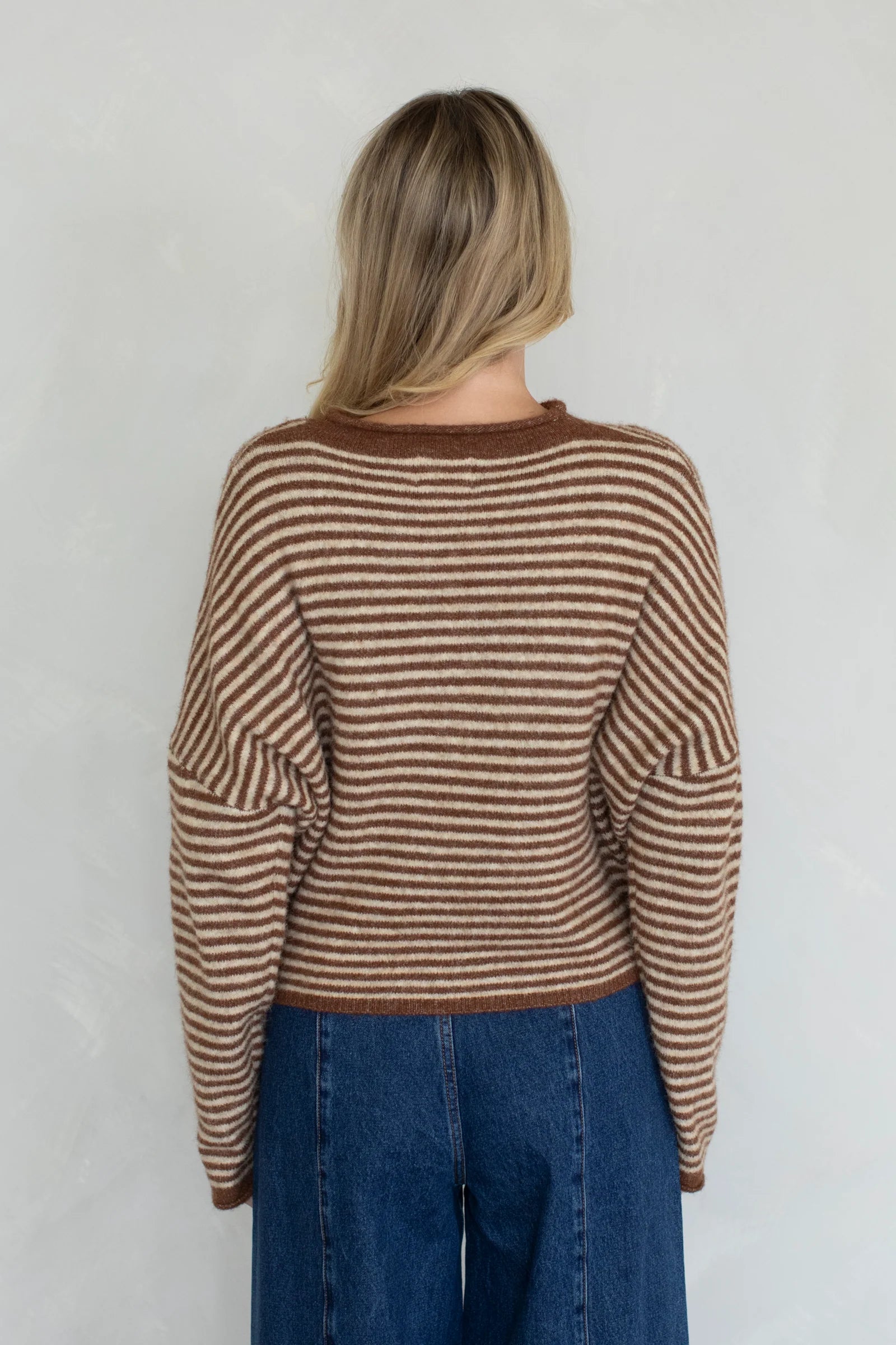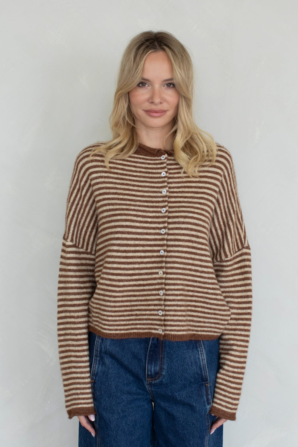 Super soft and lightweight striped cardigan with a rolled edge finish and buttons. 53% Recycled Polyester, 39% Acrylic, 5% Wool, 3% Spandex.