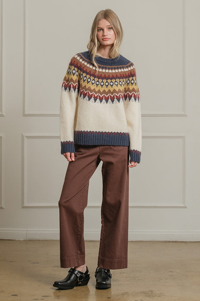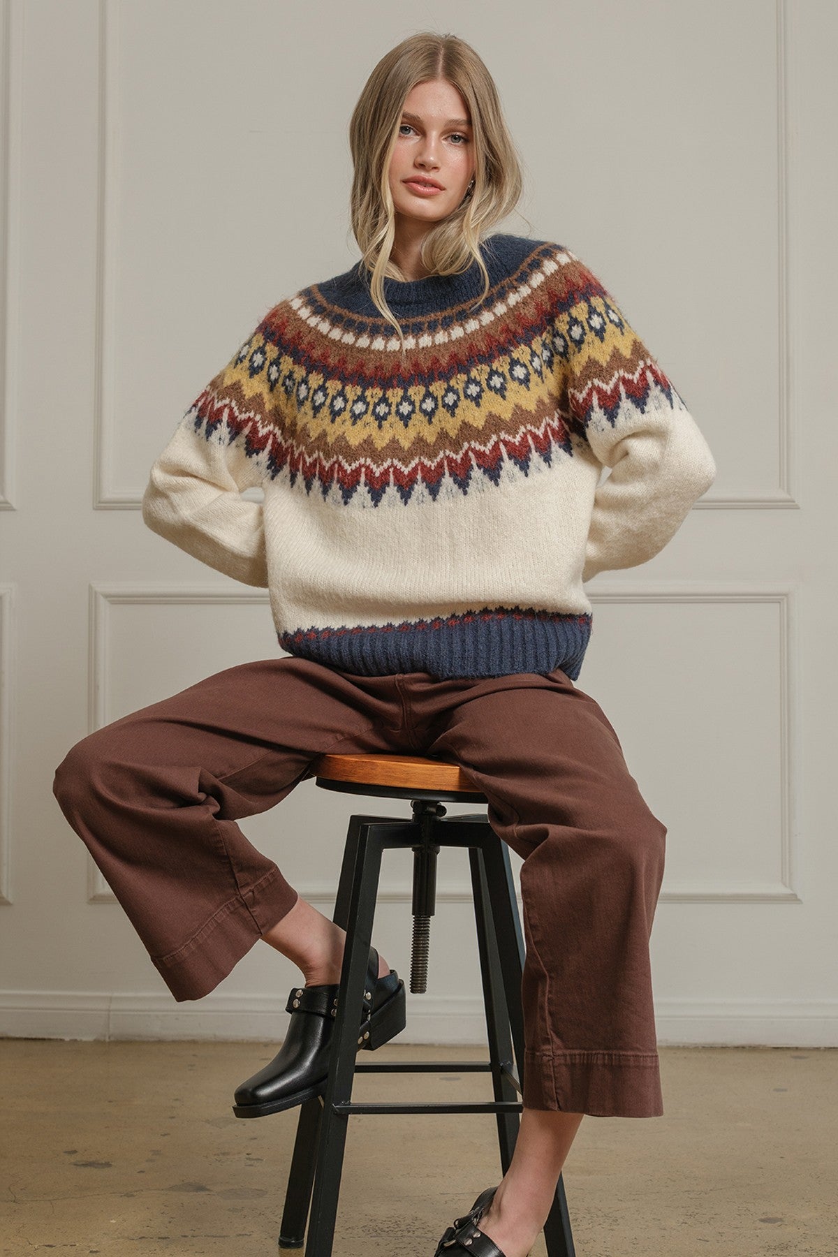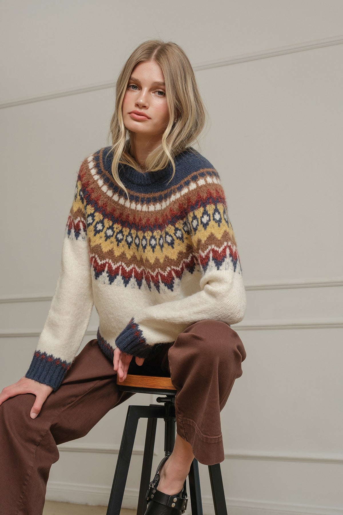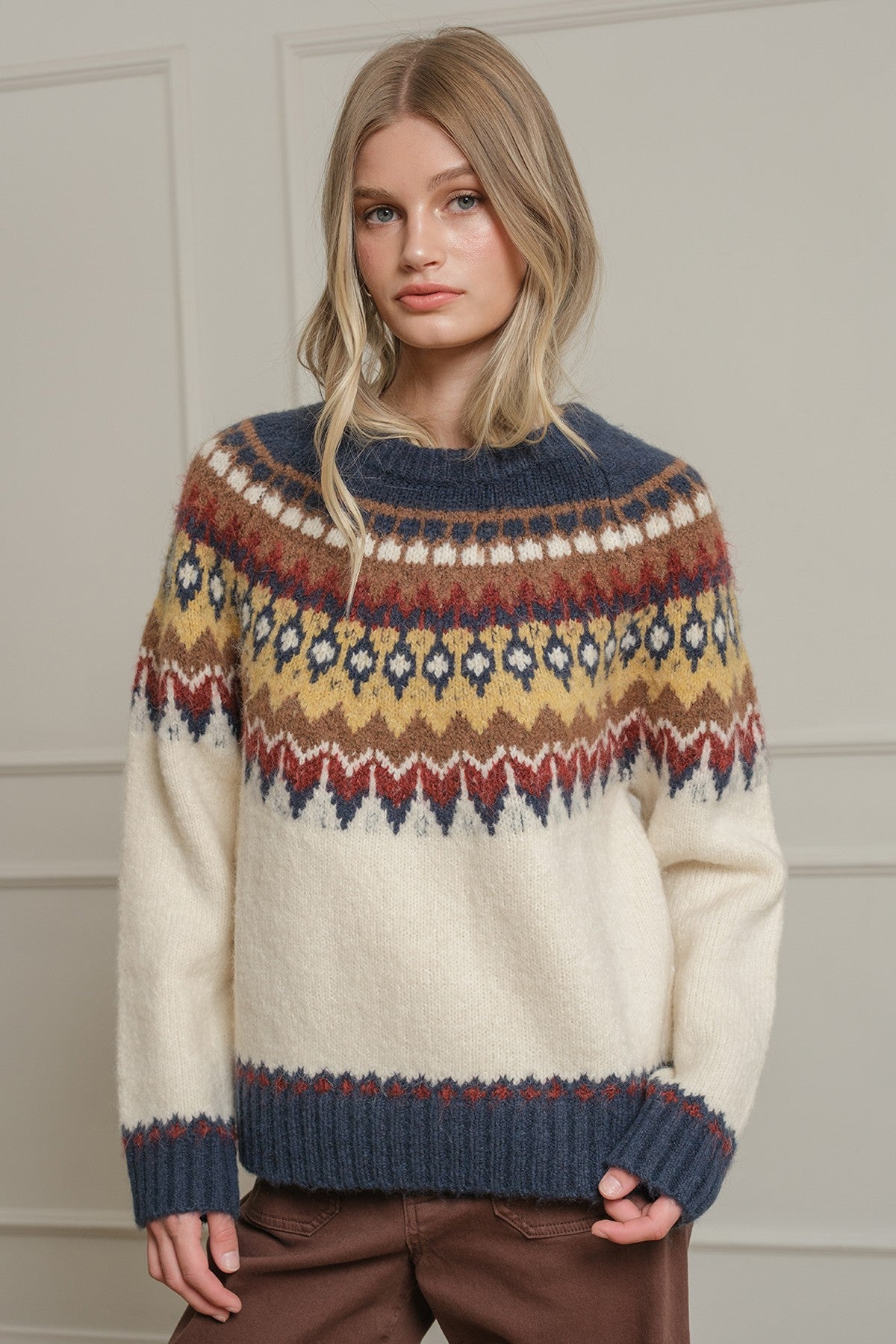 A cozy Fair Isle knit sweater featuring a multi-color yoke design in navy, mustard, burgundy, and ivory. Crafted in a soft and warm texture, this timeless winter essential adds a touch of retro charm to any outfit. Designed with a classic crew neckline, long sleeves, and ribbed hem for a comfortable fit. Perfect for layering on chilly days, from casual weekends to holiday gatherings.
