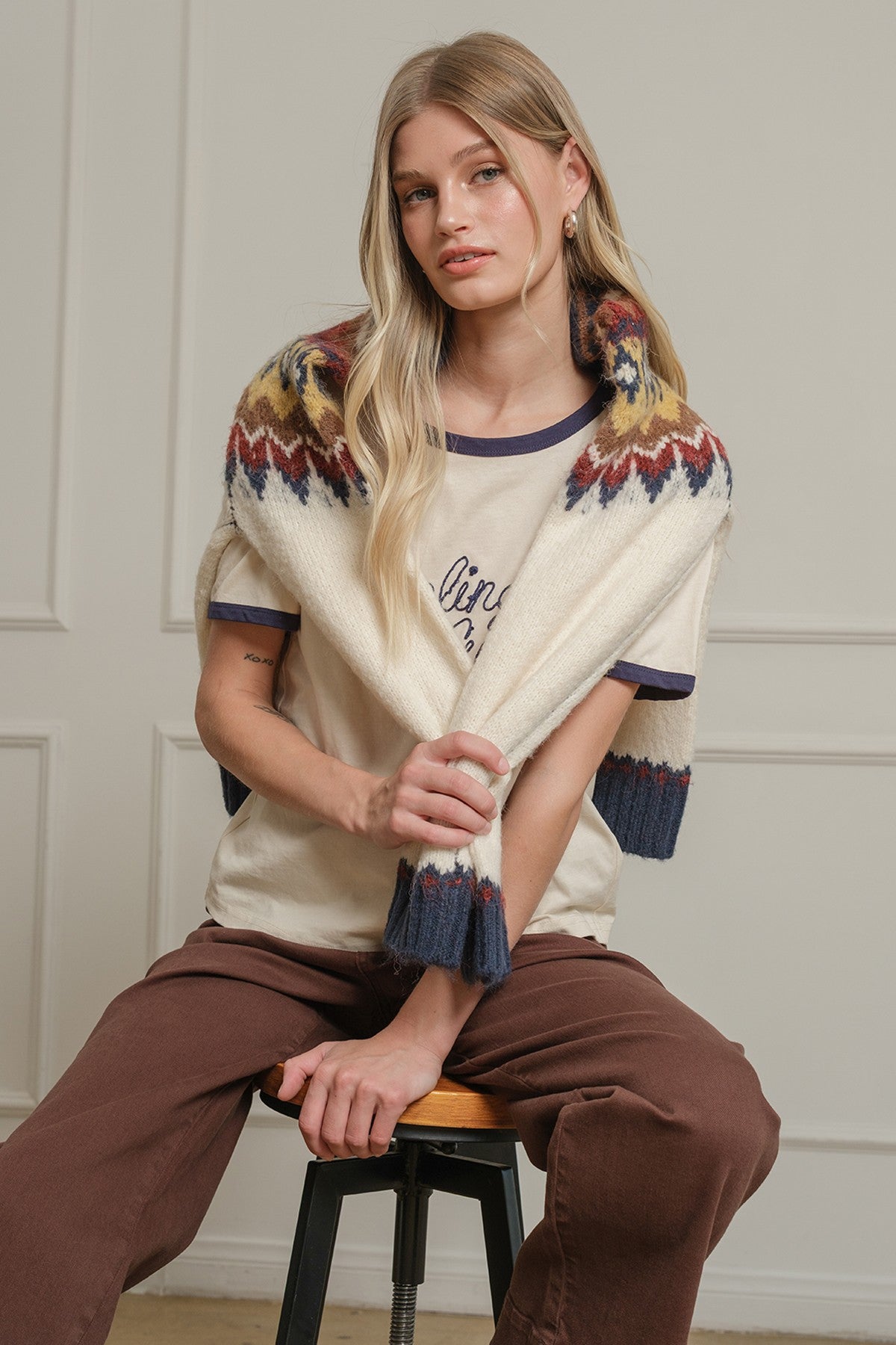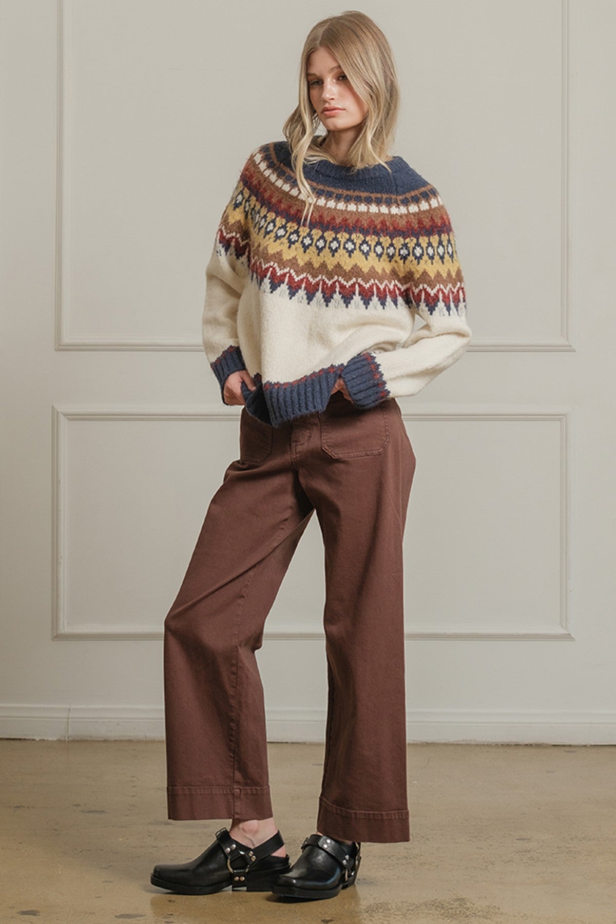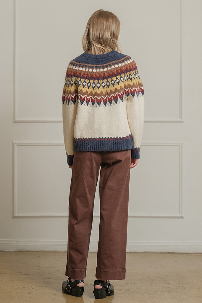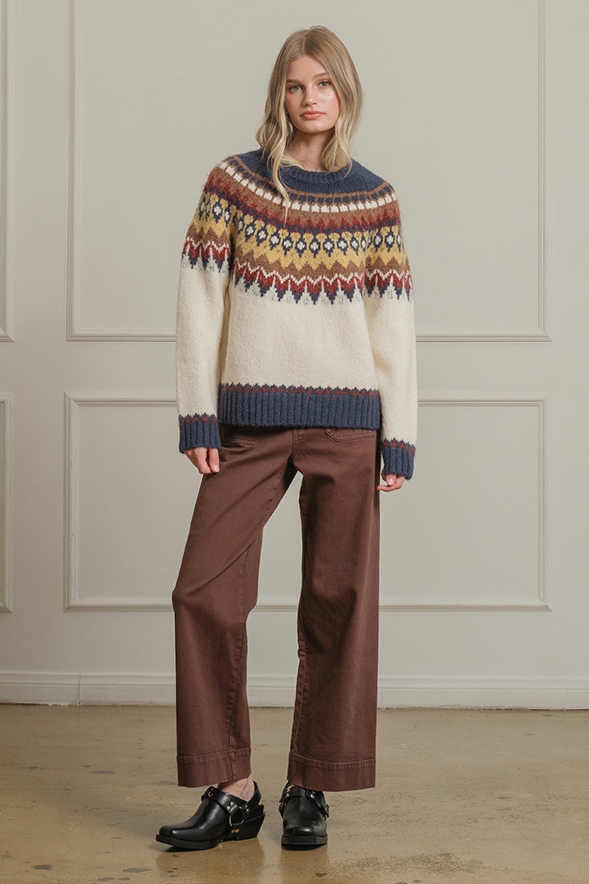 A cozy Fair Isle knit sweater featuring a multi-color yoke design in navy, mustard, burgundy, and ivory. Crafted in a soft and warm texture, this timeless winter essential adds a touch of retro charm to any outfit. Designed with a classic crew neckline, long sleeves, and ribbed hem for a comfortable fit. Perfect for layering on chilly days, from casual weekends to holiday gatherings.