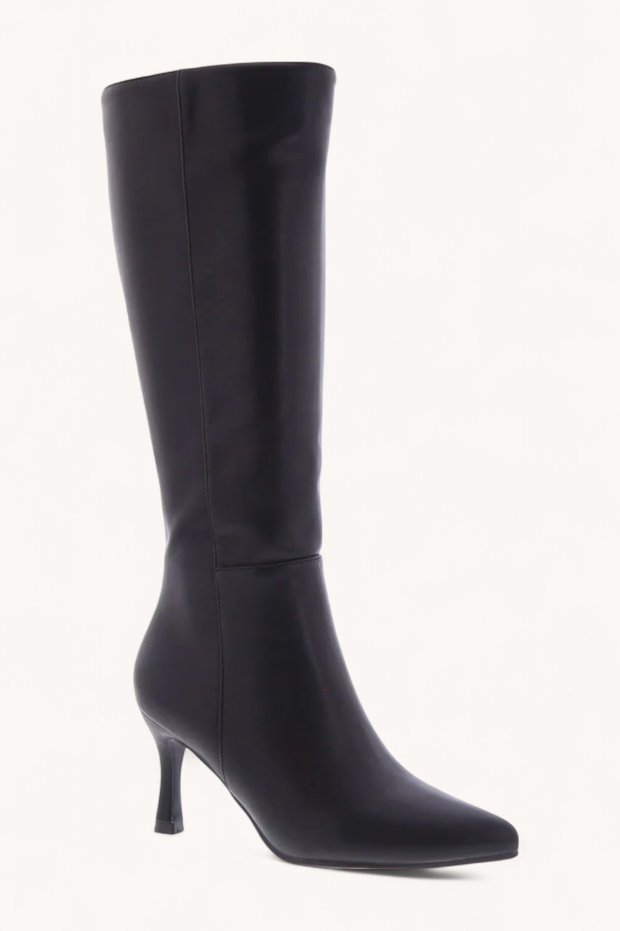 Command attention in these slim fit stiletto heel tall boots, designed to elevate any ensemble. These striking boots feature a sleek pointed-toe and a flattering, form-fitting shaft for an exceptionally elegant silhouette. A convenient full zip-up closure ensures easy wear. Perfect for evenings out or statement fashion, they promise sophisticated style with every step. Faux leather.