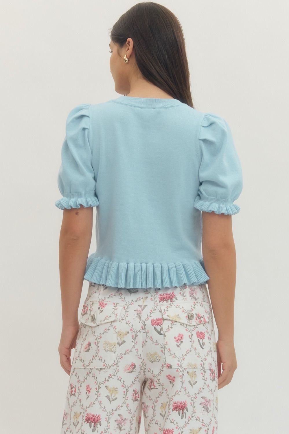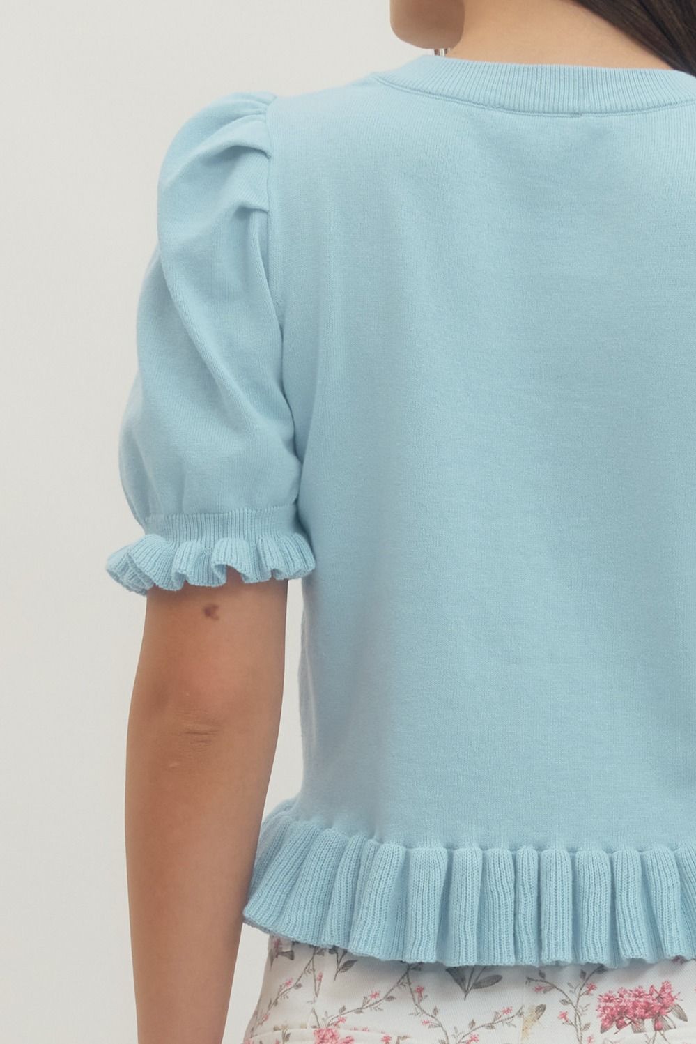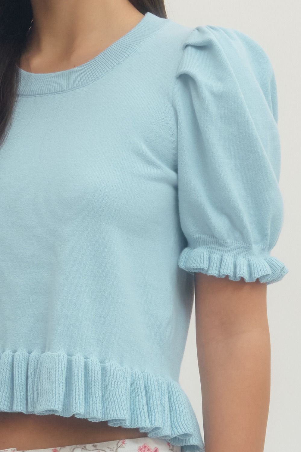 Solid short puff sleeve sweater knit top featuring ribbed ruffle trim at hem and sleeve openings. Unlined. Knit. Non-sheer. Medium weight. 100% Cotton.