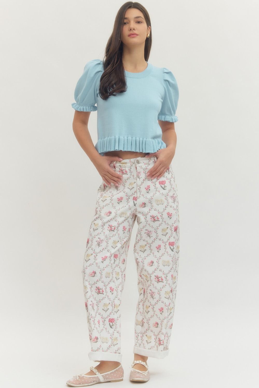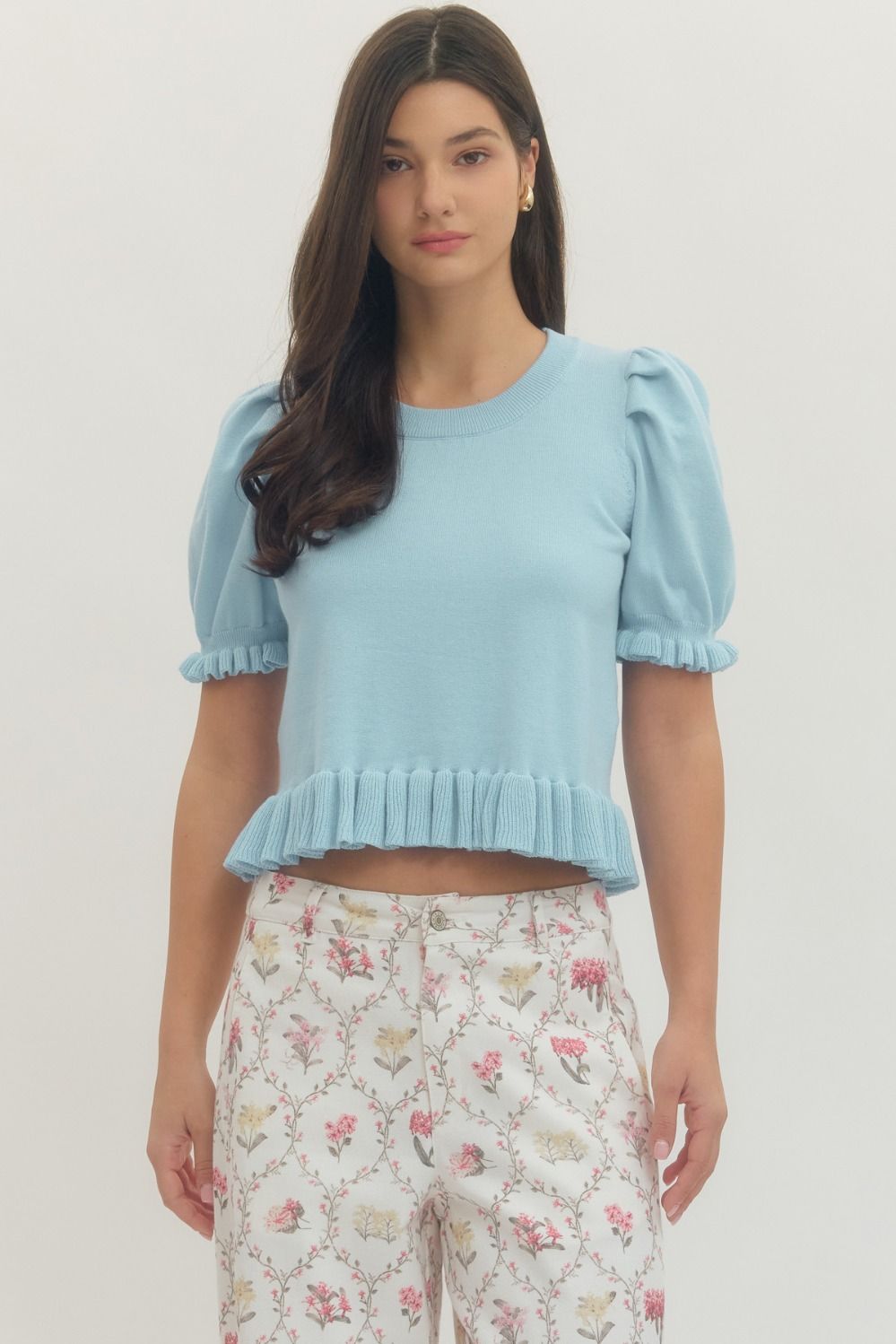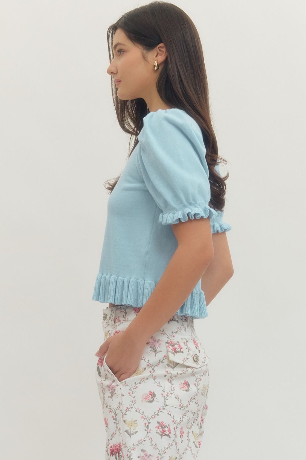Solid short puff sleeve sweater knit top featuring ribbed ruffle trim at hem and sleeve openings. Unlined. Knit. Non-sheer. Medium weight. 100% Cotton.