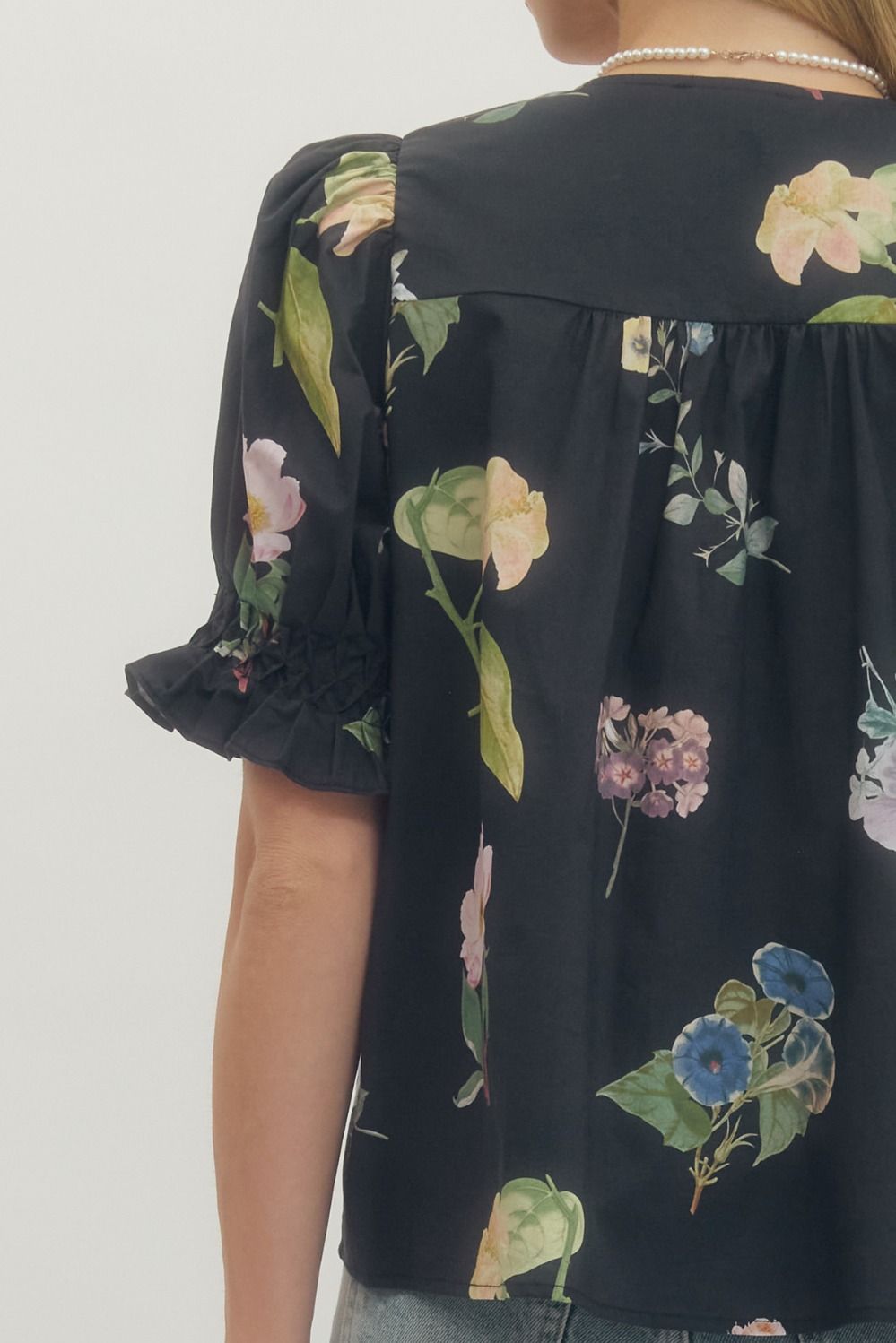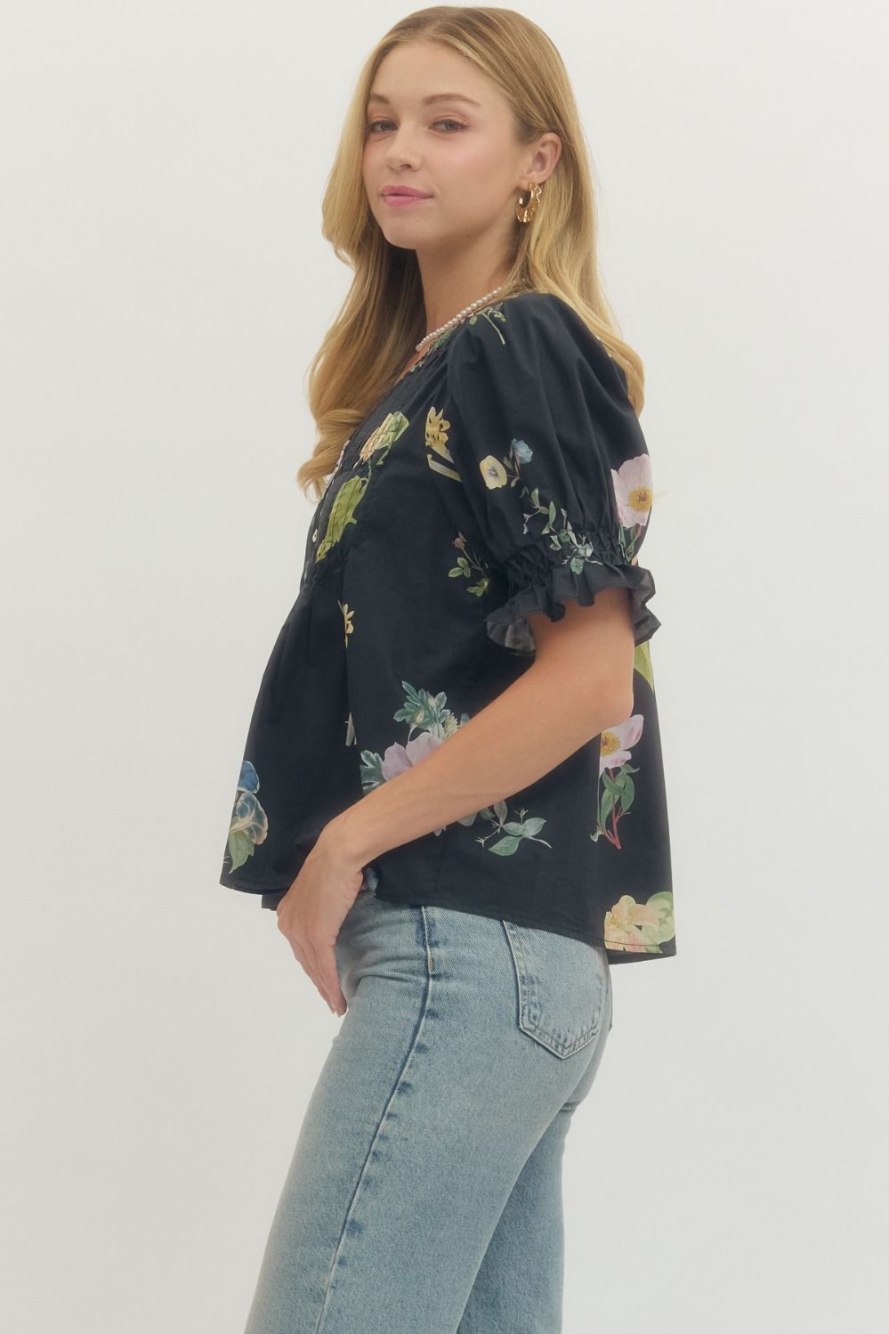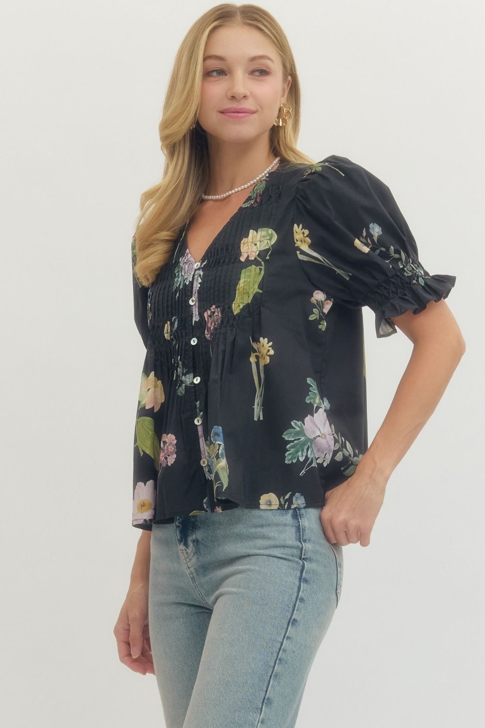 Floral print short puff sleeve blouse featuring pintuck and smocked detail at front. Button closure at front. Unlined. Woven. Non-sheer. Lightweight. 100% Cotton.