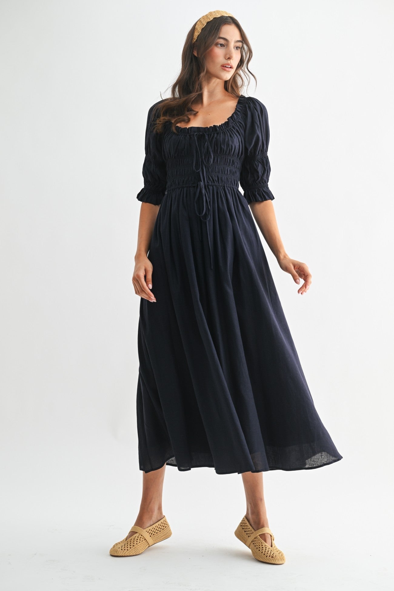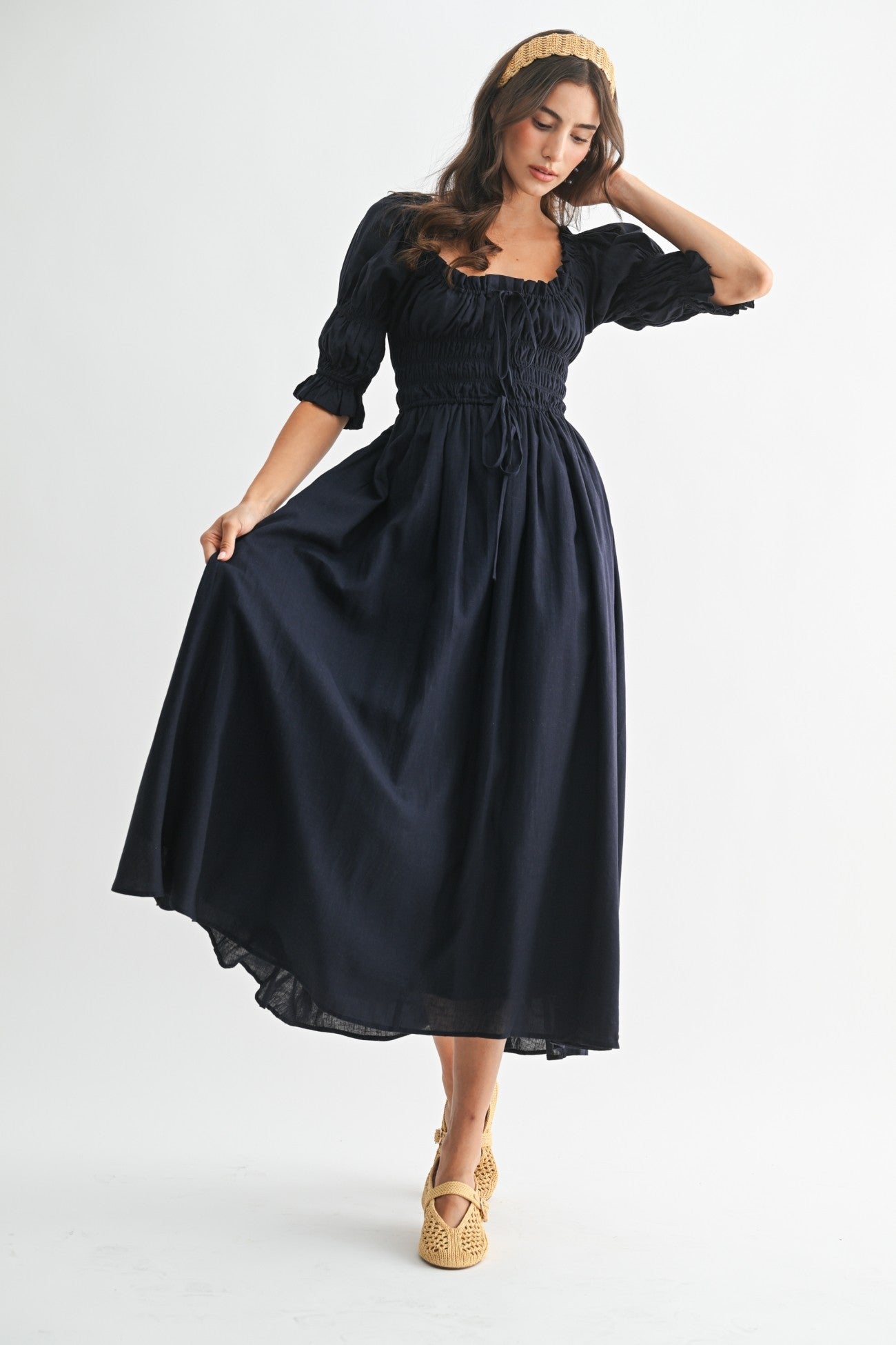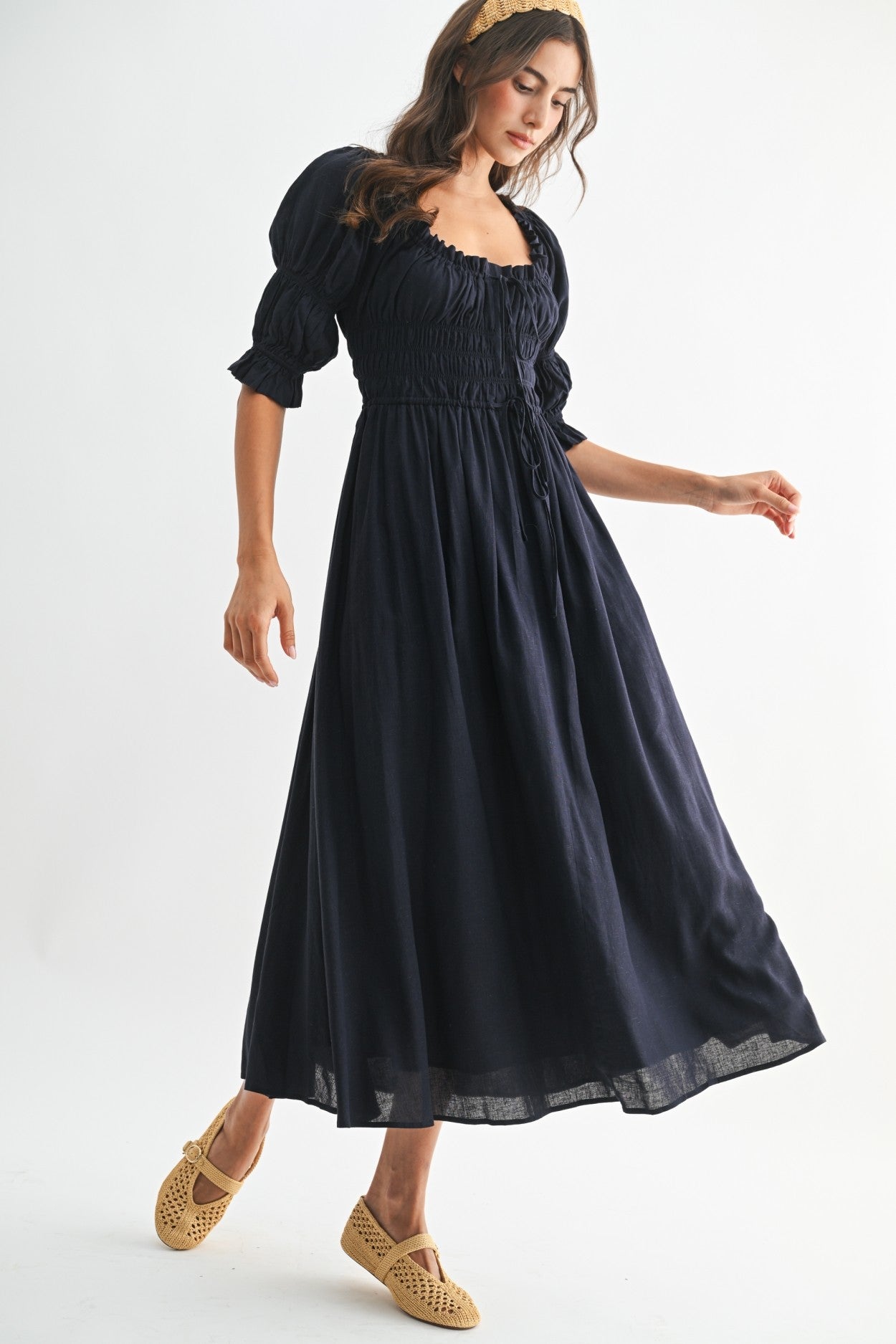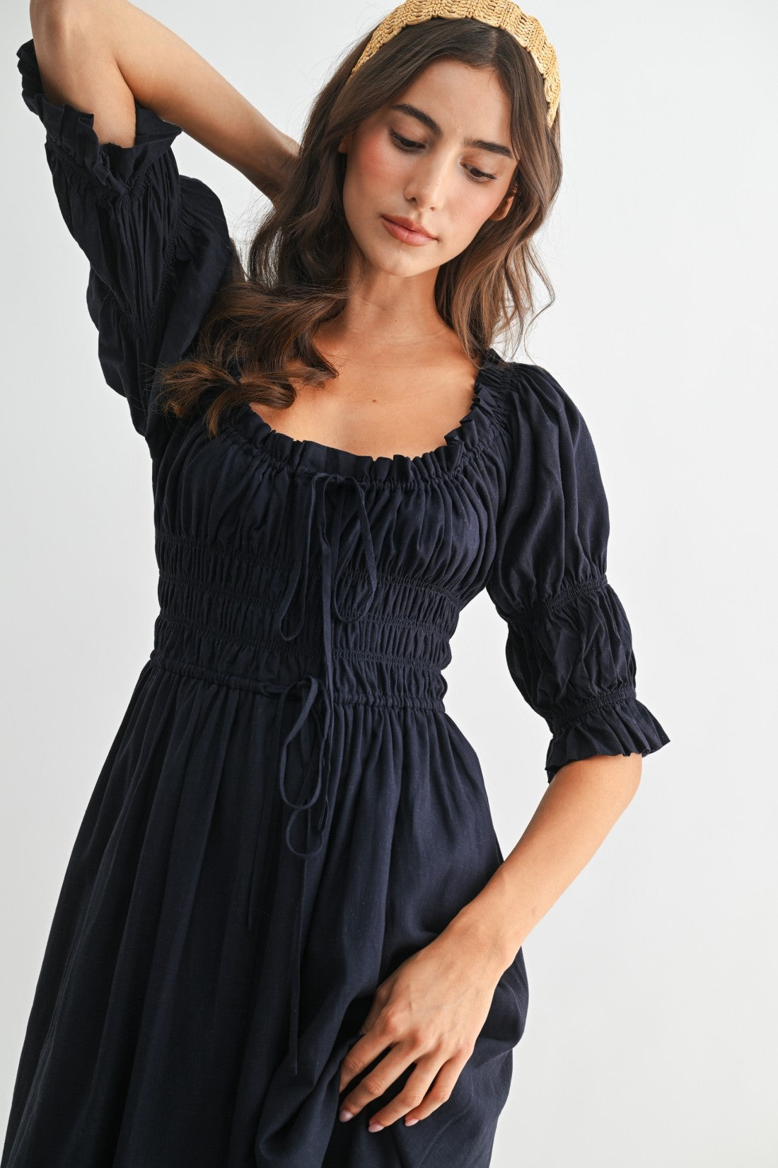 In a soft, lightweight blend of linen and rayon, this must-have features double-puffed sleeves and a scoop neckline adorned with petite ruffles and a functional center tie. A smocked bodice with an adjustable waist tie gives way to an ankle-grazing A-line skirt.