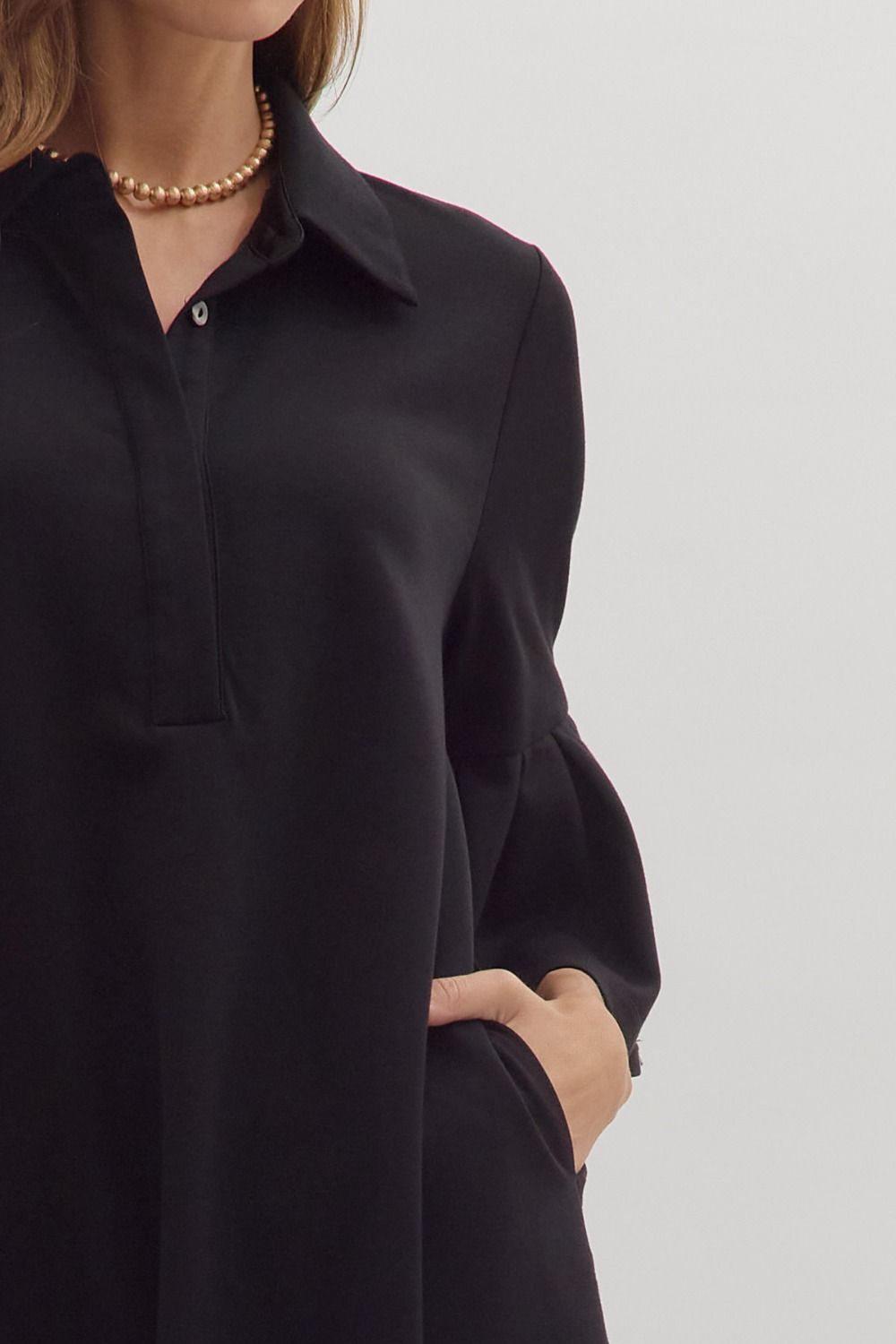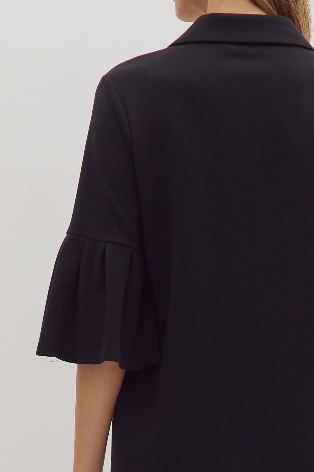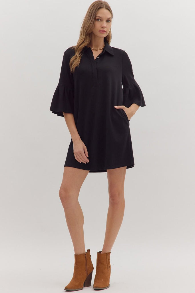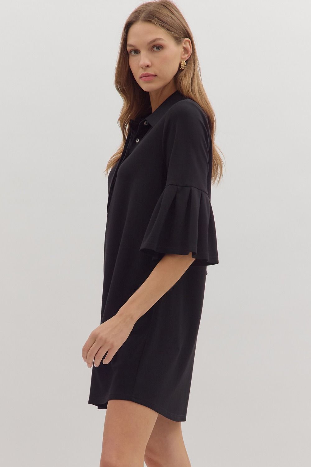 Solid collared 3/4 sleeve mini dress featuring tiered ruffle sleeve detail. Hidden button closure at front. Unlined. Knit. Non-sheer. Lightweight. 55% Rayon, 40% Polyester, 5% Spandex.
