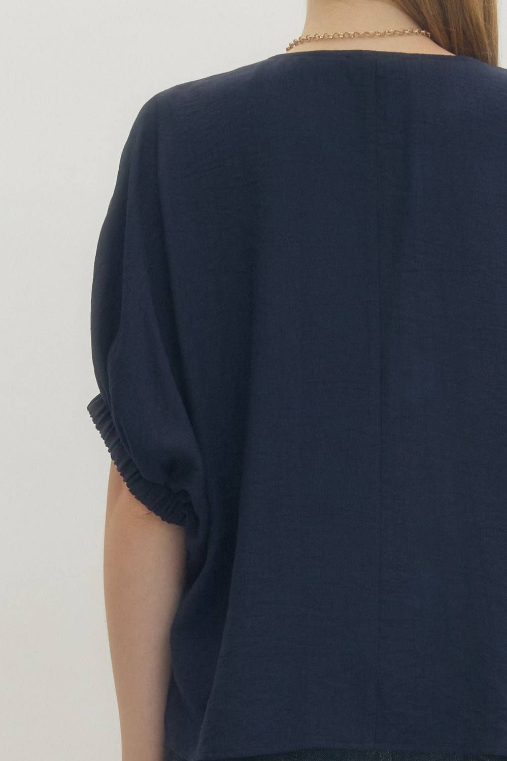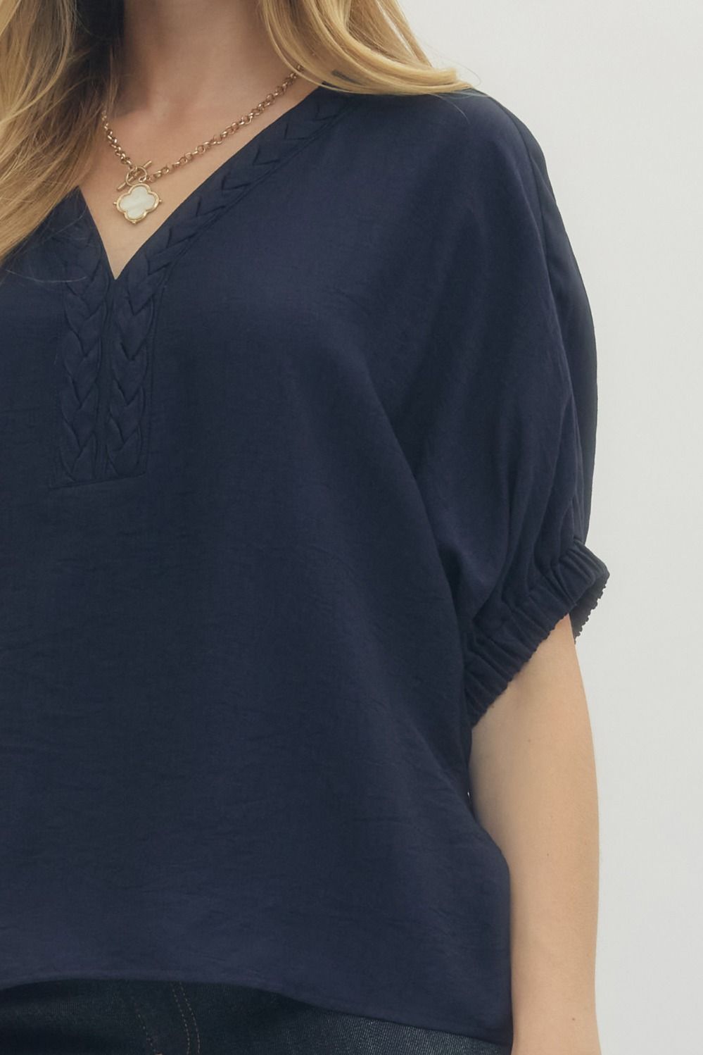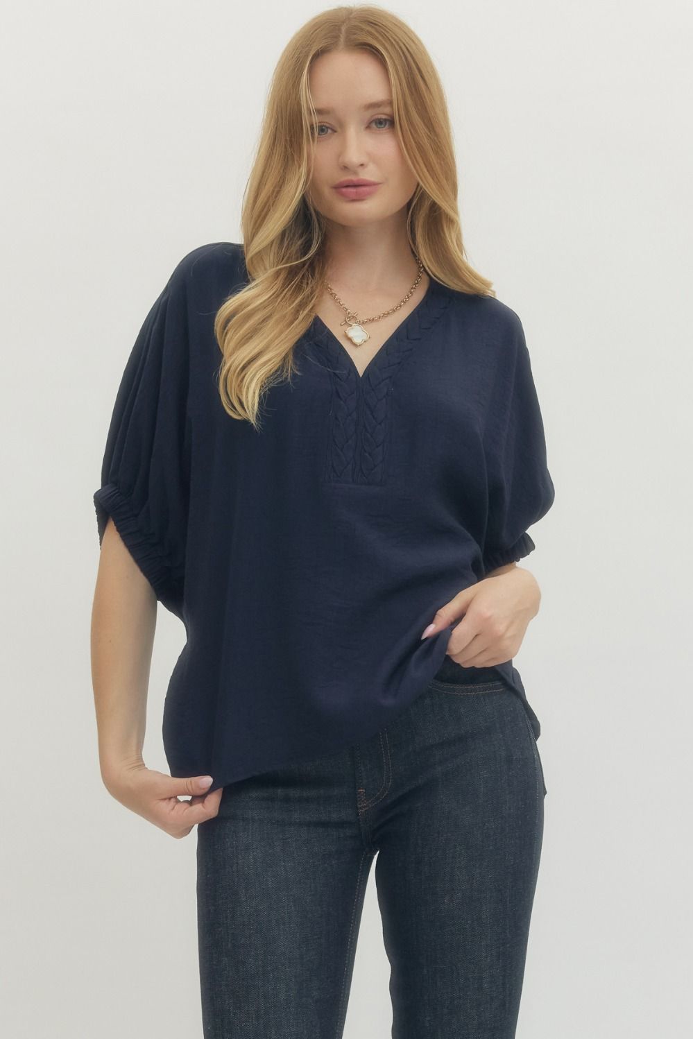 Solid dolman top featuring V-neck accent with braid detail. Unlined. Woven. Non-sheer. Lightweight. 85% Rayon, 15% Nylon.